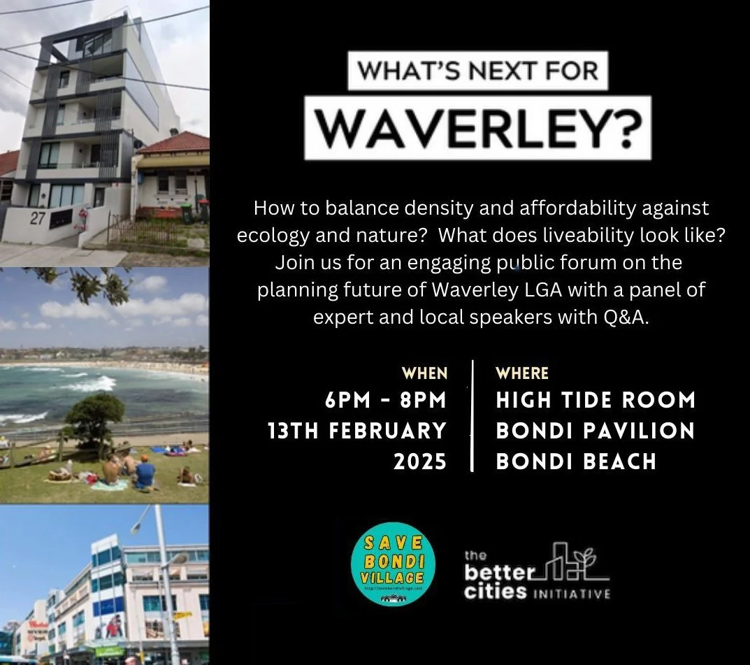 We’ve partnered with the Better Cities Initiative to deliver a forum that brings together people from all over Waverley to solve the challenge of keeping our LGA - and Bondi - a great place to live, while playing its part in solving the housing crisis.